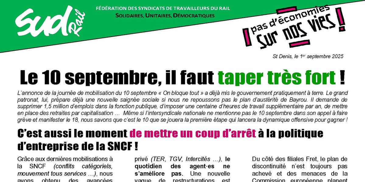 Cette semaine, nous devons déposer massivement des DII pour la journée de grève du 10 septembre. Une interfédérale cheminote est prévue mercredi 3 septembre ; nous ferons le maximum pour qu’une unité syndicale offensive se construise dans notre secteur. Sur les sites ferroviaires, il faut préparer la tenue d’Assemblées Générales afin d’analyser ensemble la situation, participer aux blocages/manifestations et débattre des perspectives