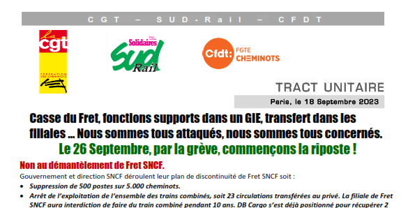 Les fédérations CGT - SUD-Rail - CFDT appellent les cheminotes et cheminots à se mettre massivement en grève le mardi 26 septembre pour mettre un coup d'arrêt à ce sabordage social.