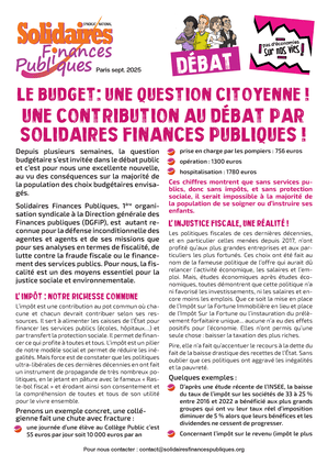 Depuis plusieurs semaines, la question budgétaire s’est invitée dans le débat public et c’est pour nous une excellente nouvelle, au vu des conséquences sur la majorité de la population des choix budgétaires envisagés. Solidaires Finances Publiques, 1ère organisation syndicale à la Direction générale des Finances publiques (DGFiP), est autant reconnue pour la défense inconditionnelle des agentes et agents et de ses missions que pour ses analyses en termes de fiscalité, de lutte contre la fraude fiscale ou le financement des services publics. Pour nous, la fiscalité est un des moyens essentiel pour la justice sociale et environnementale.