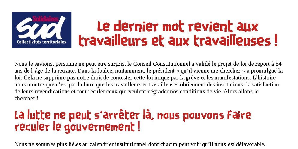 Nous le savions, personne ne peut être surpris, le Conseil Constitutionnel a validé le projet de loi de report à 64 ans de l’âge de la retraite. Dans la foulée, nuitamment, le président « qu’il vienne me chercher » a promulgué la loi. Cela ne supprime pas notre droit de contester cette loi inique par la grève et les manifestations. L’histoire nous montre que c’est par la lutte que les travailleurs et travailleuses obtiennent des institutions, la satisfaction de leurs revendications et font reculer ceux qui veulent dégrader nos conditions de vie. Alors allons le chercher !