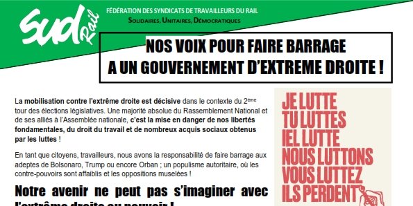 La mobilisation contre l’extrême droite est décisive dans le contexte du 2ème tour des élections législatives. Une majorité absolue du Rassemblement National et de ses alliés à l’Assemblée nationale, c’est la mise en danger de nos libertés fondamentales, du droit du travail et de nombreux acquis sociaux obtenus par les luttes !
