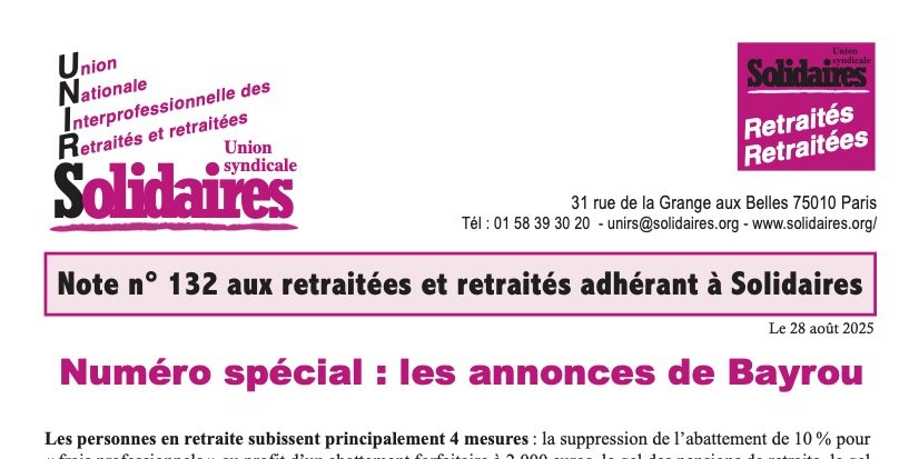 Note mensuelle de l'UNIRS aout 2025, spéciale annonces de Bayrou