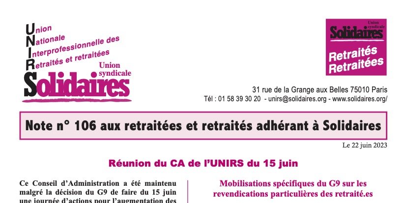 Note mensuelle de l'UNIRS de juin 2023