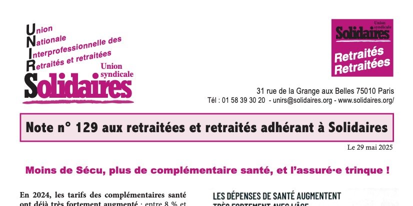 Voici la note mensuelle de l'UNIRS, envoyée à toutes les personnes retraitées dont nous avons les adresses internet.