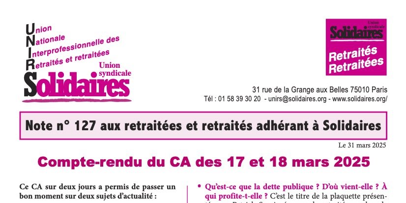 Voici la note mensuelle de l'UNIRS, envoyée à toutes les personnes retraitées dont nous avons les adresses internet.