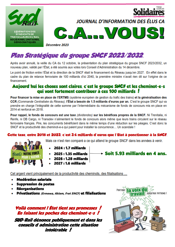 Après avoir annulé, la veille du Conseil d'Administration du 12 octobre, la présentation du plan stratégique du groupe SNCF 2023/2032, un nouveau plan, validé par l’État, a été soumis aux votes lors Conseil d’Administration du 14 décembre.