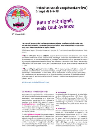 - Sur le volet santé et sur la solidarité, les choix de l’administration sont désormais clairs mais ils doivent encore être retranscrits dans un cahier des charges pour que le ministère lance la procédure de marché public ; le risque d’une attaque en justice par des cabinets d’avocats spécialisés au service des assureurs qui perdraient l’appel d’offre est réel ; Solidaires a cependant fait le choix d’une première information, voir le message interne aux Finances adressé à tous les agent.es par messagerie le 15 mars.