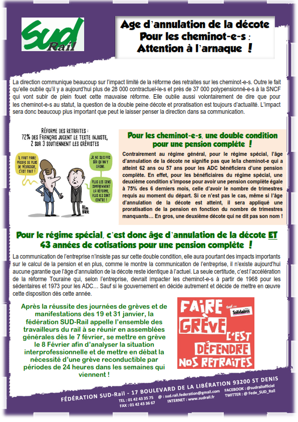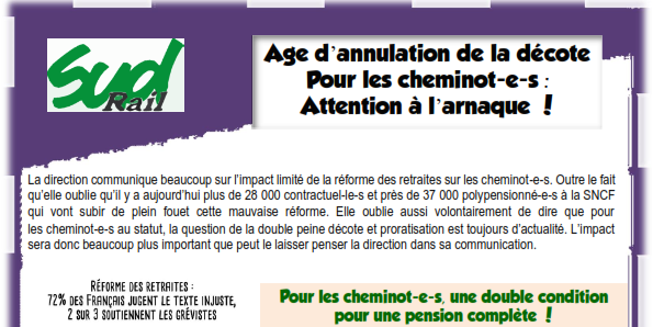La direction SNCF communique beaucoup sur l’impact limité de la réforme des retraites sur les cheminot-e-s. Outre le fait qu’elle oublie qu’il y a aujourd’hui plus de 28 000 contractuel-le-s et près de 37 000 polypensionné-e-s à la SNCF qui vont subir de plein fouet cette mauvaise réforme. Elle oublie aussi volontairement de dire que pour les cheminot-e-s au statut, la question de la double peine décote et proratisation est toujours d’actualité. L’impact sera donc beaucoup plus important que peut le laisser penser la direction dans sa communication.