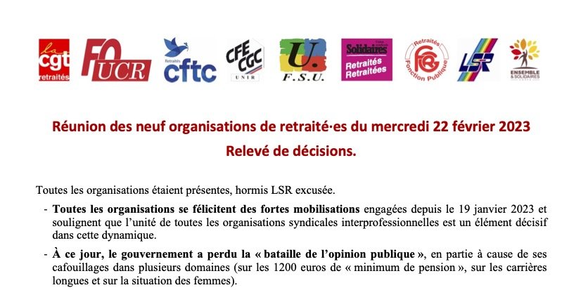 - Toutes les organisations se félicitent des fortes mobilisations engagées depuis le 19 janvier 2023 et soulignent que l’unité de toutes les organisations syndicales interprofessionnelles est un élément décisif dans cette dynamique.