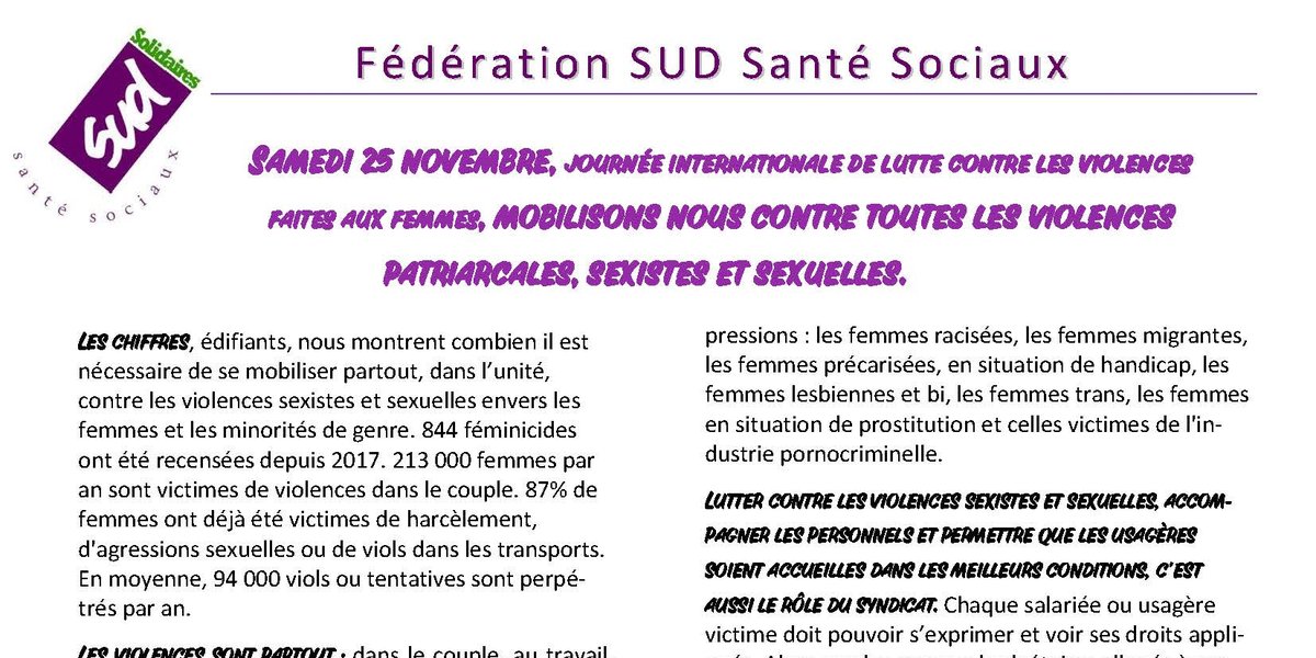 Samedi 25 novembre, journée internationale de lutte contre les violences faites aux femmes, mobilisons nous contre toutes les violences patriarcales, sexistes et sexuelles.