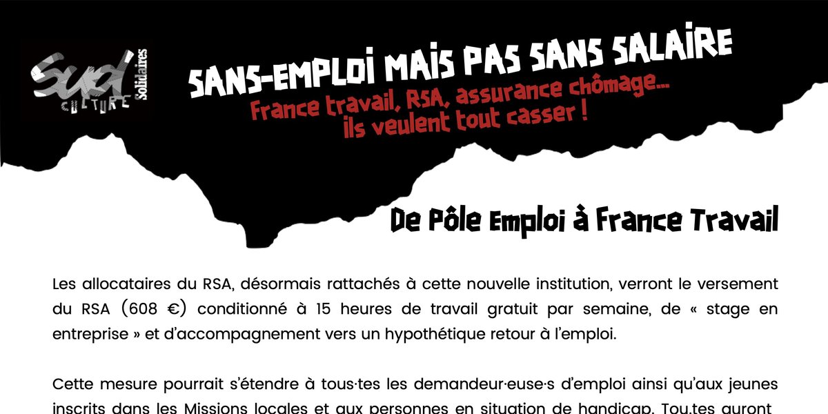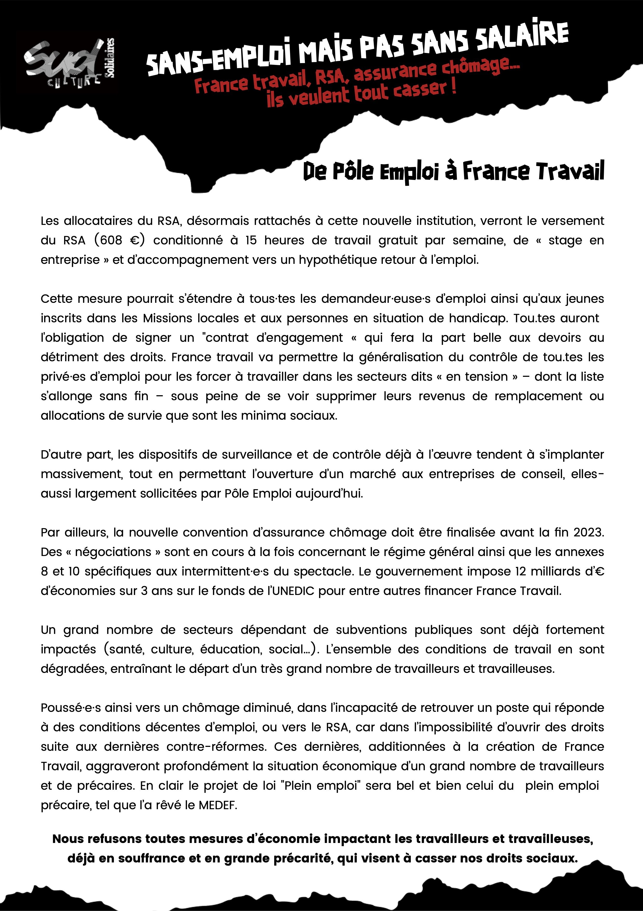 Poussé·e·s ainsi vers un chômage diminué, dans l’incapacité de retrouver un poste qui réponde à des conditions décentes d’emploi, ou vers le RSA, car dans l’impossibilité d’ouvrir des droits suite aux dernières contre-réformes. Ces dernières, additionnées à la création de France Travail, aggraveront profondément la situation économique d’un grand nombre de travailleurs et de précaires. En clair le projet de loi "Plein emploi" sera bel et bien celui du plein emploi précaire, tel que l’a rêvé le MEDEF.