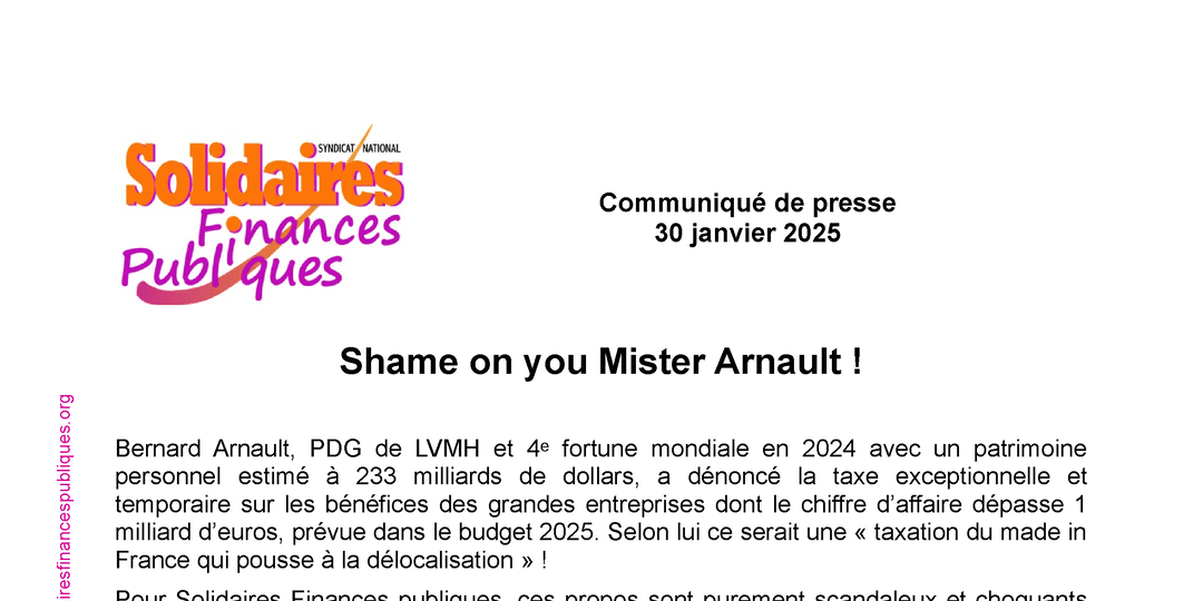 Pour Solidaires Finances publiques, ces propos sont purement scandaleux et choquants dans un contexte où les entreprises du CAC 40 ne cessent d’accroître leurs profits et les dividendes versées aux actionnaires ont, en 2024 connu une nouvelle fois un record tandis que les inégalités, la pauvreté et les injustices explosent.