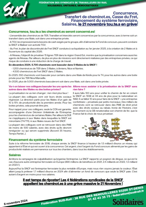Il est temps de riposter ! Les 4 fédérations syndicales de la SNCF appellent les cheminotes et cheminots à une grève massive le 21 novembre !
