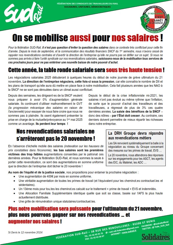 En l’absence d’échelle mobile des salaires (indexation sur les hausses de prix constatées dans l'économie), les bas salaires sont les premières victimes des trop faibles augmentations consenties par le patronat ces dernières années. Pour la fédération SUD-Rail, et nous sommes la seule à porter cette revendication, ce sont des augmentations en somme uniforme que la direction de l’entreprise doit lâcher le 20 novembre !