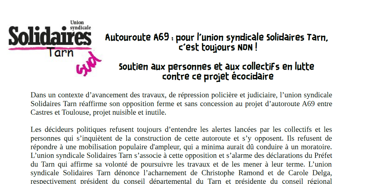 Solidaires Tarn - Autouroute A69 : Pour l’Union syndicale Solidaires Tarn, c’est toujours NON ! Soutien aux personnes et aux collectifs en lutte contre ce projet écocidaire