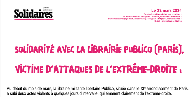 L‘union syndicale Solidaires condamne très fermement ces attaques contre la librairie Publico et assure de sa solidarité syndicale les animateurs/trices de cette librairie, les membres de son organisation et le public qui la fréquente.
