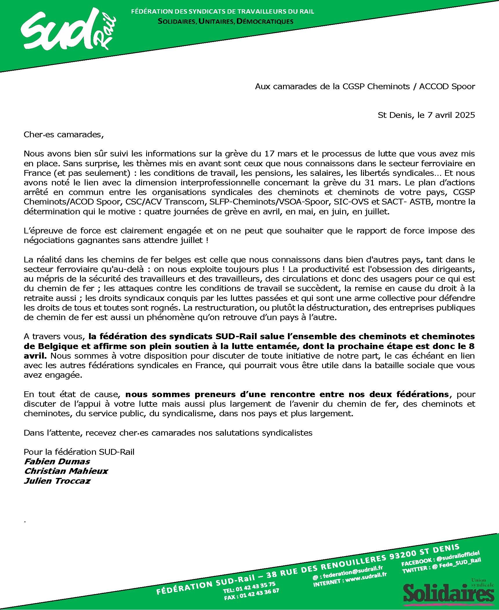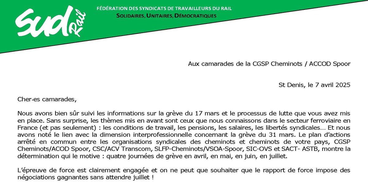Vous trouverez un courrier de notre organisation syndicale aux camarades de la CGSP Cheminots, en soutien au processus de lutte mis en place unitairement en Belgique.