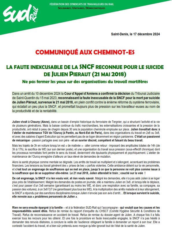 Dans un arrêt du 10 décembre 2024 la Cour d’Appel d’Amiens a confirmé la décision du Tribunal Judiciaire de Saint-Quentin du 15 mai 2023, reconnaissant la faute inexcusable de la SNCF pour la mort par suicide de Julien Piéraut, survenue le 21 mai 2018, en plein conflit contre la énième réforme du système ferroviaire, qui éclatait un peu plus la SNCF, et promettait toujours plus de pression sur les travailleur-euses au nom de la productivité et de la rentabilité.