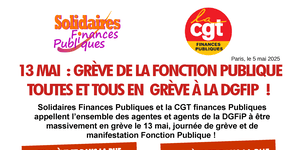 Solidaires Finances Publiques et la CGT finances Publiques appellent l’ensemble des agentes et agents de la DGFiP à être massivement en grève le 13 mai, journée de grève et de manifestation Fonction Publique !
