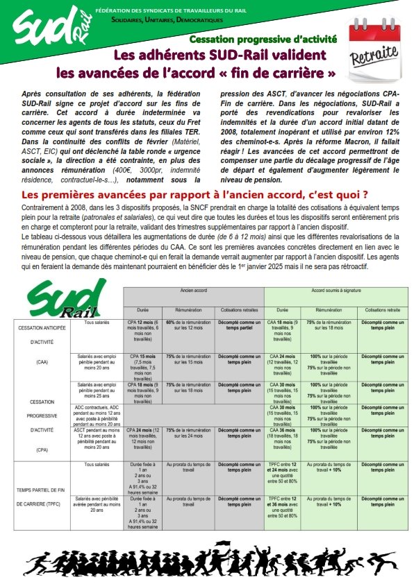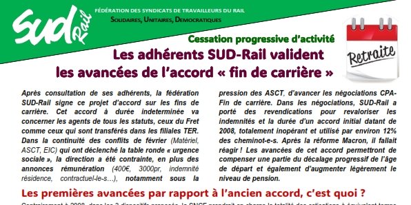 Après consultation de ses adhérents, la fédération SUD-Rail signe ce projet d’accord sur les fins de carrière. Cet accord à durée indéterminée va concerner les agents de tous les statuts, ceux du Fret comme ceux qui sont transférés dans les filiales TER.
