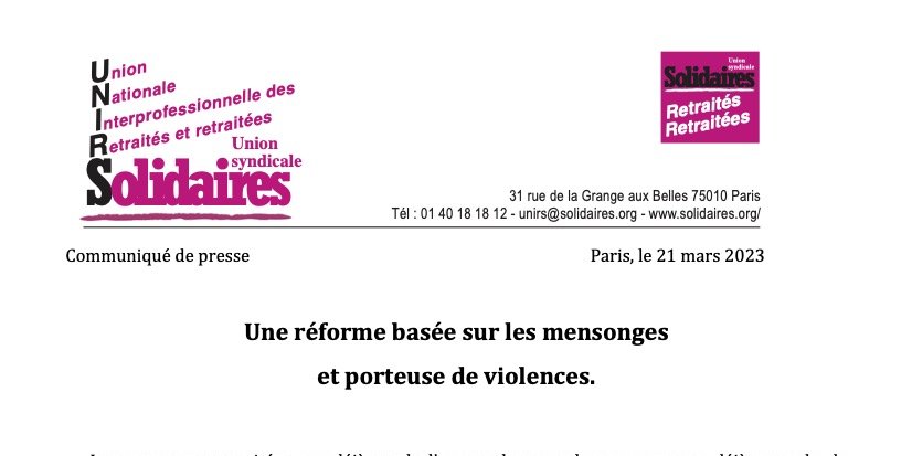 C’est ce que nous exigerons encore ce jeudi 23 mars 2023, avec les manifestations qui sont appelées par l’intersyndicale nationale avec ses déclinaisons locales. À Paris, la manifestation partira à 14 heures de la Place de la Bastille, pour aller à Opéra, en passant par la Place de la République (le cortège de Solidaires étant en tête).