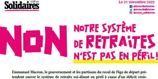 - Septembre 2022 : Réforme des retraites : ce que veut le gouvernement travailler plus et plus longtemps pour de petites retraites ! https://solidaires.org/sinformer-et-agir/actualites-et-mobilisations/nationales/reforme-des-retraites-ce-que-veut-le-gouvernement-travailler-plus-et-plus-longtemps-pour-de-petites-retraites/