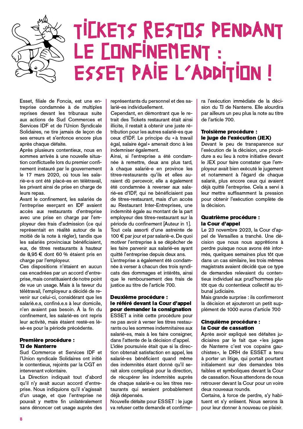 Après avoir expliqué ses défaites judiciaires par le fait que « les juges de Nanterre c’est vos copains gauchistes », le DRH de ESSET a tenu à porter un litige, qui portait pourtant initialement sur des demandes très faibles et symboliques devant la Cour de cassation. Nous attendons de nous retrouver devant la Cour pour un voire deux nouveaux rounds.