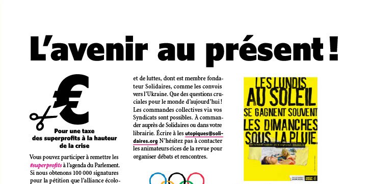 Pour leur numéro d'hiver 2022 (le numéro 21 déjà !), les Utopiques (la revue de Solidaires) s’attaque à la thématique : « Impérialisme, guerre, paix, syndicalisme ». Au travers d’une présentation de nombreux pays et contextes, on y trouve des réflexions sur l’action syndicale en période de guerre ou sur ce que veut dire anti-impérialisme aujourd’hui. On y découvre aussi les activités du Réseau syndical international de Solidarité et de luttes, dont est membre fondateur Solidaires, comme les convois vers l’Ukraine. Que des questions cruciales pour le monde d’aujourd’hui !