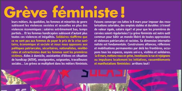 La grève féministe est notre outil commun pour bâtir un monde libéré de toutes oppressions et violences patriarcales et racistes. Sa dimension internationaliste est fondamentale. Construisons alliances, réflexions et mobilisations permanentes par delà les frontières, occupons tous les espaces, soyons uni·e·s, visibles et solidaires.