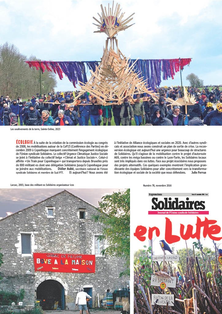 Il n’y a pas d’emploi sur une planète morte et la reconversion écologique est aujourd’hui une urgence absolue pour beaucoup de structure de Solidaires! Qu’il s’agisse de la mobilisation contre le projet d’autoroute A69 entre Castre et Toulouse, contre les méga bassines, contre le Lyon-Turin ou contre l’implantation d’un site Rockwool de fabrication de laine de roche hautement polluant, les Solidaires locaux sont très impliqués dans ces luttes contre les projets écocides. Face à ces projets destructeurs nous proposons des projets alternatifs à l’image de SUD Rail avec tout une plateforme sur le développement des transports publics et du fret ferroviaire. Ces quelques exemples montrent l’implication grandissante des équipes Solidaires pour aller concrètement vers la transformation écologique et sociale de la société que nous défendons.