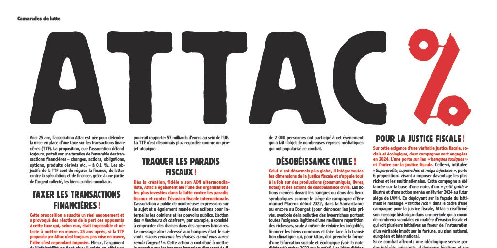 Si ce combat est rude et affronte une idéologique servie par des intérêts puissants, il n’en demeure pas moins non seulement légitime mais également de plus en plus reconnu. A l’instar du conflit contre la « réforme des retraites » dans lequel Attac s’est engagé aux côtés des organisations syndicales, mais qu’Emmanuel Macron et son gouvernement ont imposée de force en 2023, la demande d’une véritable justice fiscale n’est certes par parvenue à entrer concrètement dans le faits, mais elle s’est imposée dans le débat public.
