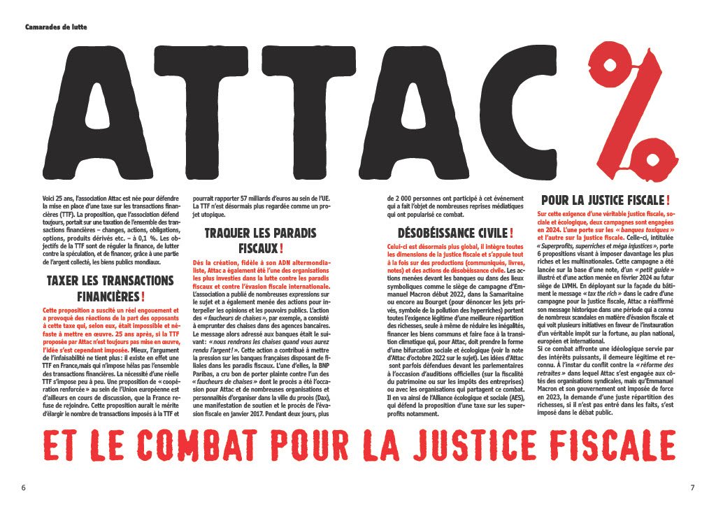 C’est sur cette exigence d’une véritable justice fiscale, sociale et écologique qu’ont été engagées deux campagnes en 2024. L’une porte sur les « banques toxiques » et l’autre, complémentaire, sur la justice fiscale. Celle-ci, intitulée « Superprofits, superriches et méga injustices », portent 6 propositions visant à imposer davantage les plus riches et les multinationales. Cette campagne a été lancée sur la base d’une note, d’un « petit guide » illustré et d’une action menée en février 2024 au futur siège de LVMH, dont le patron est la personnalité la plus riches du monde. En déployant sur la façade du bâtiment le message « tax the rich » dans le cadre d’une campagne pour la justice fiscale, Attac a réaffirmé son message historique dans une période qui a connu de nombreux scandales ne matière d'évasion fiscale et qui connaît dans la période actuelle plusieurs initiatives en faveur, notamment, de l’instauration d’un véritable impôt sur la fortune, au plan national, européen et international.