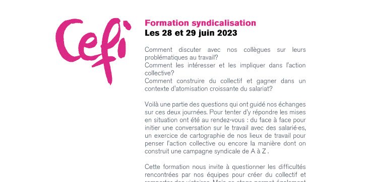 Cette formation nous invite à questionner les difficultés rencontrées par nos équipes pour créer du collectif et remporter des victoires. Mais ce stage permet également et surtout, de souligner la nécessité de transmettre davantage nos pratiques syndicales de terrain existantes, de rendre visibles nos victoires et la manière dont nous construisons pas à pas l'action collective.