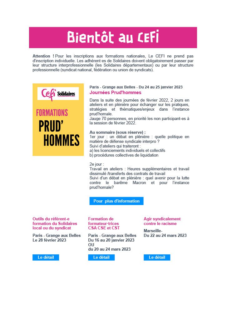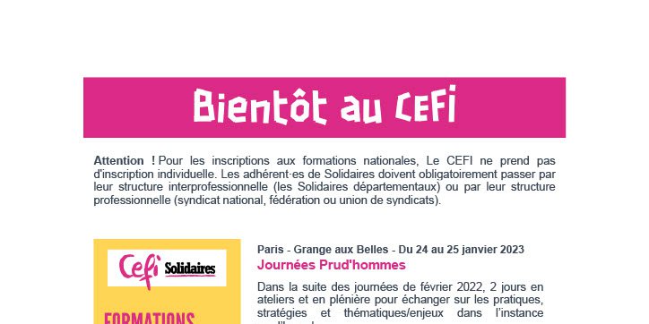 Attention ! Pour les inscriptions aux formations nationales, Le CEFI ne prend pas d'inscription individuelle. Les adhérent·es de Solidaires doivent obligatoirement passer par leur structure interprofessionnelle (les Solidaires départementaux) ou par leur structure professionnelle (syndicat national, fédération ou union de syndicats).