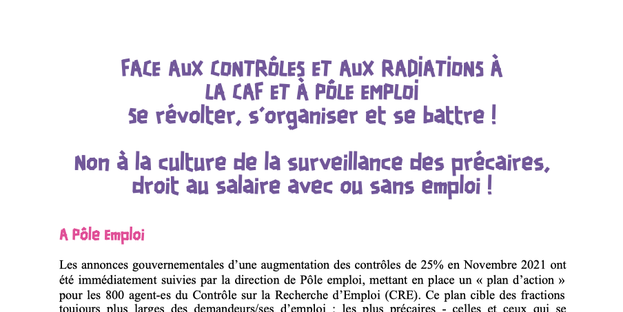 A la bourse du travail de Paris, des assemblées générales ont lieu régulièrement, organisées par le collectif intersyndical contre les contrôles et radiations à la CAF et à Pôle emploi : CGT Chômeurs/ses, Solidaires, SUD Emploi, SUD Culture Solidaires, Coordination des intermittent·e·s et précaires d'Ile-de-France, Stop Précarité, APEIS. D'autres initiatives doivent être organisées dans d'autres villes !