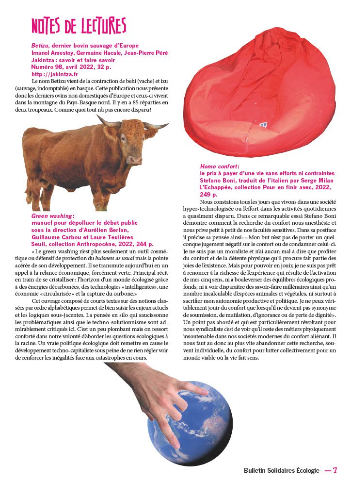 Cet ouvrage composé de courts textes sur des notions clas- sées par ordre alphabétiques permet de bien saisir les enjeux actuels et les logiques sous-jacentes. La pensée en silo qui saucissonne les problématiques ainsi que le techno-solutionnisme sont ad- mirablement critiqués ici. C’est un peu plombant mais on ressort conforté dans notre volonté d’aborder les questions écologiques à la racine. Un vraie politique écologique doit remettre en cause le développement techno-capitaliste sous peine de ne rien régler voir de renforcer les inégalités face aux catastrophes en cours.