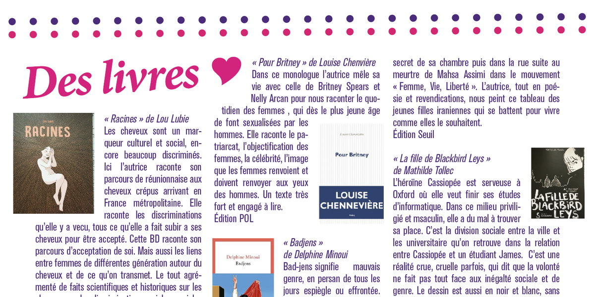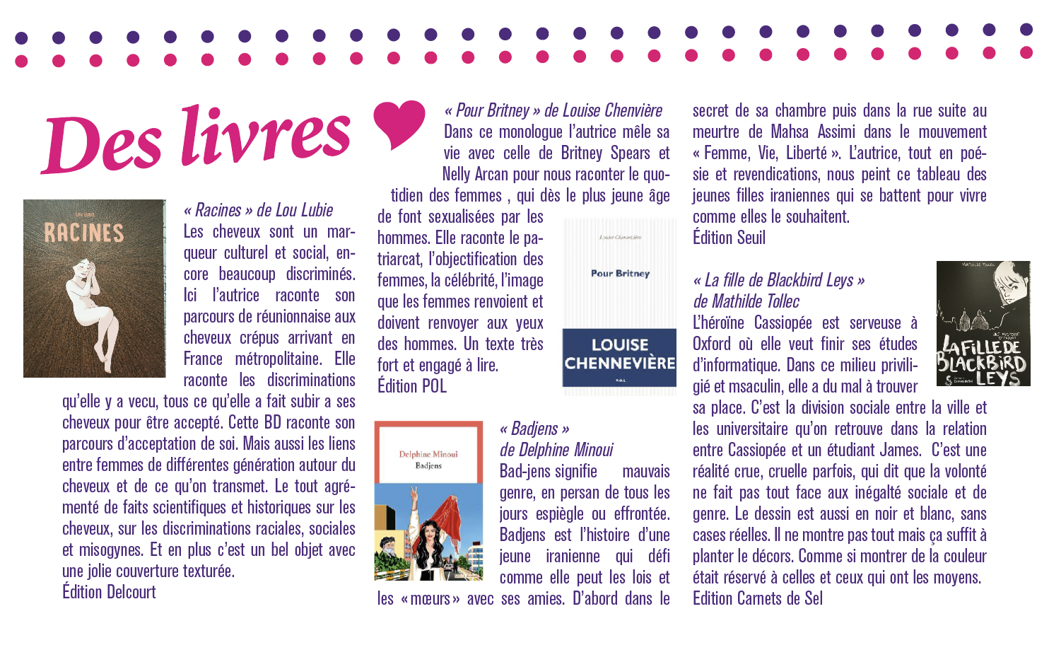 Les cheveux sont un marqueur culturel et social, encore beaucoup discriminés. Ici l’autrice raconte son parcours de réunionnaise aux cheveux crépus arrivant en France métropolitaine. Elle raconte les discriminations qu’elle y a vecu, tous ce qu’elle a fait subir a ses cheveux pour être accepté. Cette BD raconte son parcours d’acceptation de soi. Mais aussi les liens entre femmes de différentes génération autour du cheveux et de ce qu’on transmet. Le tout agrémenté de faits scientifiques et historiques sur les cheveux, sur les discriminations raciales, sociales et misogynes. Et en plus c’est un bel objet avec une jolie couverture texturée.