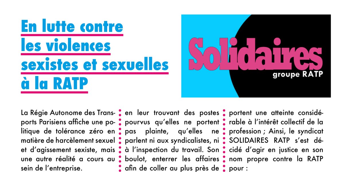 SOLIDAIRES RATP accompagne et défends plusieurs agentes victimes auprès des juridictions compétentes. Le constat est édifiant. Dans les nombreux rapports, nous constatons que la régie ne reconnaît jamais le harcèlement sexuel. C’est allant au-delà des rapports et enquêtes internes que nous avons pu mettre en avant le déni de l’entreprise et par la même l’instauration d’une impunité grandissante.