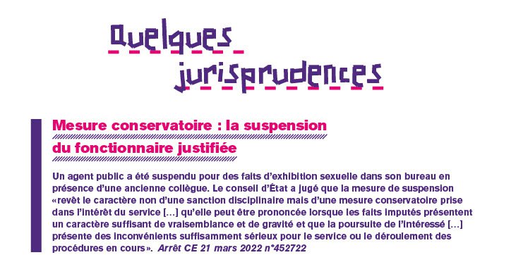 Un agent public a été suspendu pour des faits d’exhibition sexuelle dans son bureau en présence d’une ancienne collègue. Le conseil d’Etat a jugé que la mesure de suspension « revêt le caractère non d’une sanction disciplinaire mais d’une mesure conservatoire prise dans l’intérêt du service […] qu’elle peut être prononcée lorsque les faits imputés présentent un caractère suffisant de vraisemblance et de gravité et que la poursuite de l’intéressé […] présente des inconvénients suffisamment sérieux pour le service ou le déroulement des procédures en cours ».