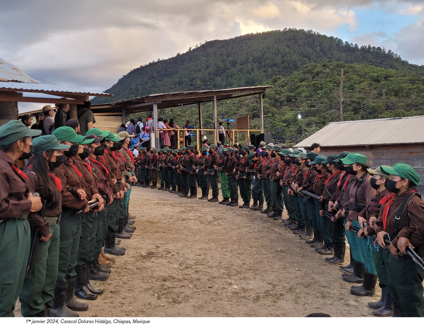 L’Armée zapatiste de libération nationale (EZLN : Ejército Zapatista de Liberación Nacional) a été fondée le 17 novembre 1983 dans les montagnes du sud-est mexicain (il y a 40 ans). Ce groupe de guérilleros se revendiquant du Che Guevara s’installe dans un territoire habité par des Mayas et leur projet révolutionnaire s’imprègne de leur culture et de leur langue. Leurs façons de penser se transforment profondément avec l’intégration de femmes et d’hommes principalement Tzeltales et Tzotziles (cultures mayas) : le projet de soulèvement armé se consolide, la place de la vie communautaire maya devient centrale, avec une importante participation des femmes qui imposent la loi révolutionnaire des femmes pour l’égalité en 1993. Ce sont les peuples zapatistes qui votent le soulèvement en 1993.