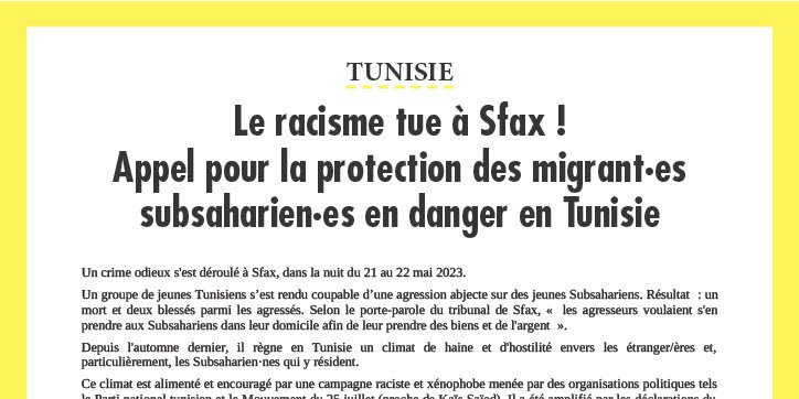 Depuis l'automne dernier, il règne en Tunisie un climat de haine et d'hostilité envers les étranger/ères et, particulièrement, les Subsaharien·nes qui y résident.