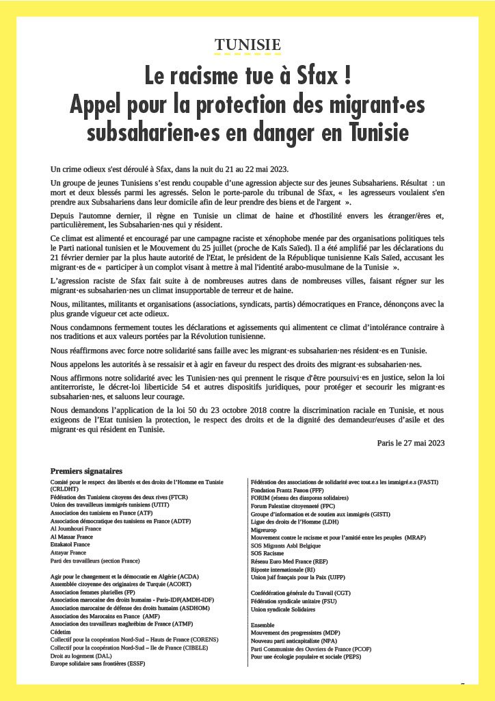 Nous affirmons notre solidarité avec les Tunisien·nes qui prennent le risque d'être poursuivi·es en justice, selon la loi antiterroriste, le décret-loi liberticide 54 et autres dispositifs juridiques, pour protéger et secourir les migrant·es subsaharien·nes, et saluons leur courage.